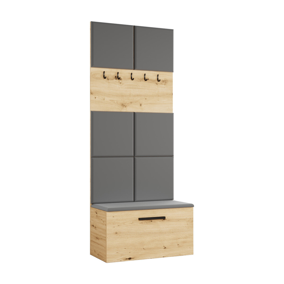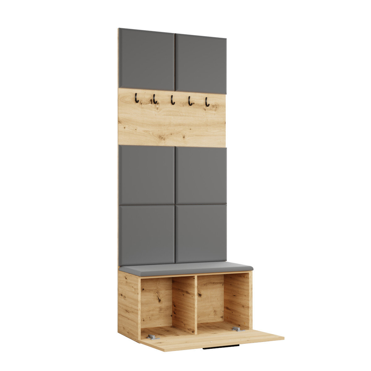 Dzięki przemyślanej konstrukcji, garderoba modułowa Margaret I oferuje w jednym miejscu wszystko, czego potrzebujesz: wygodne siedzisko, praktyczne wieszaki na ubrania oraz pojemną szafkę.