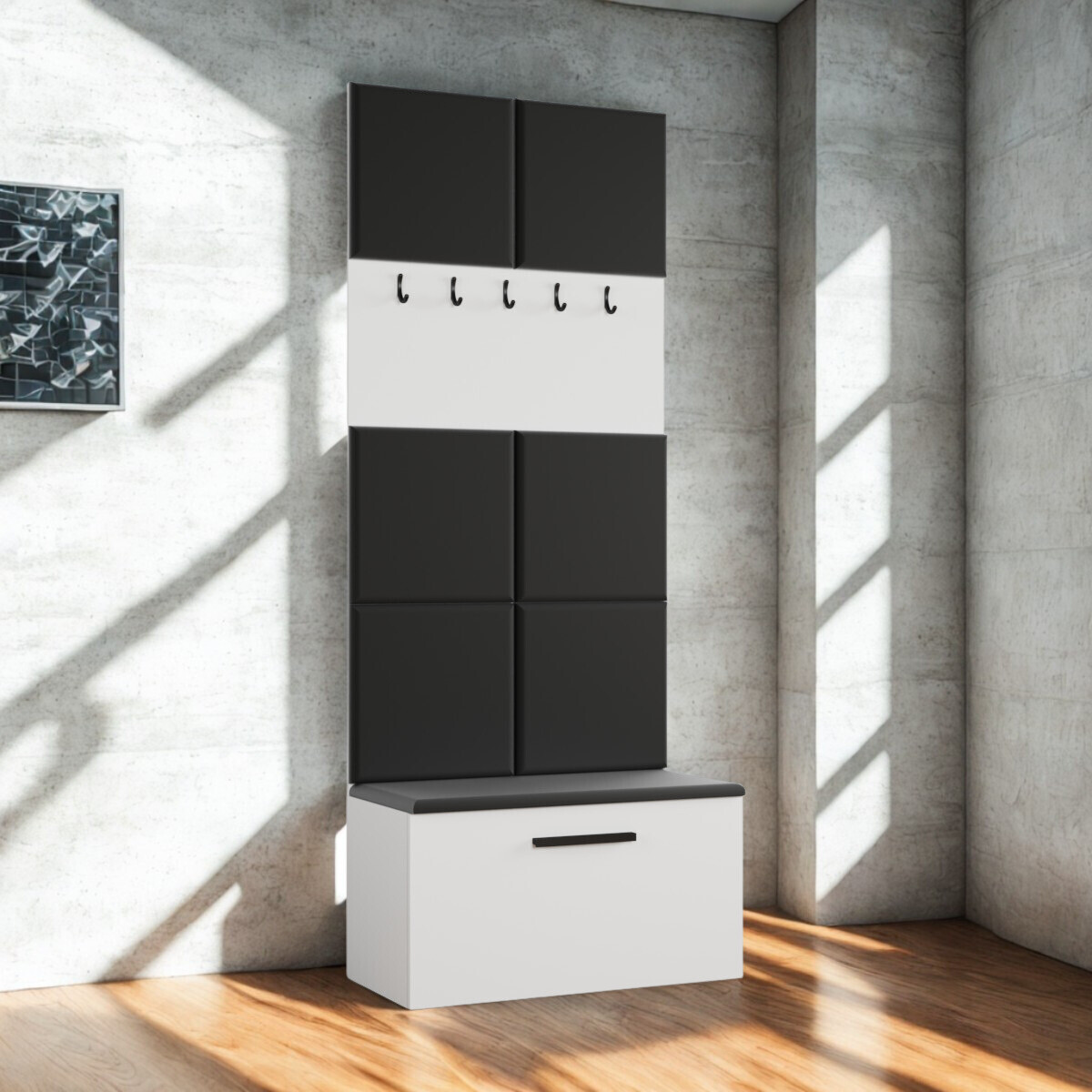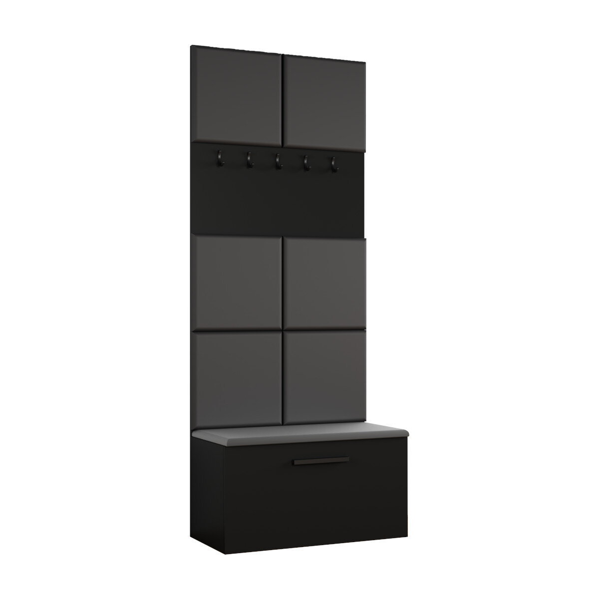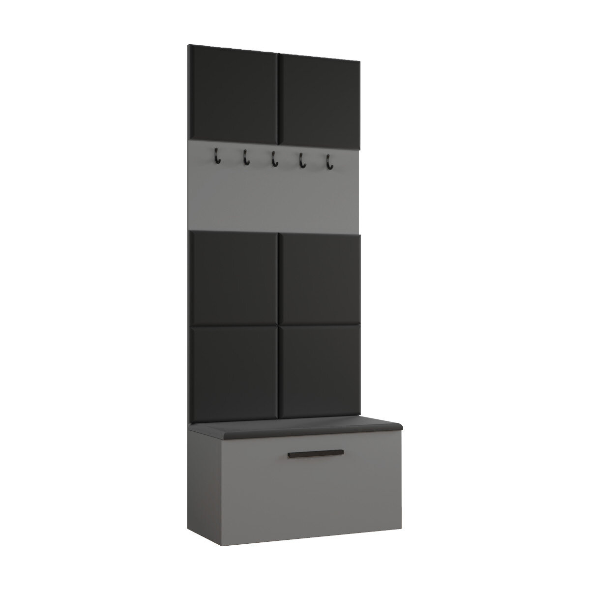Stwórz stylowy i funkcjonalny przedpokój z naszą garderobą modułową Margaret I. Ten nowoczesny zestaw łączy w sobie miękkie, tapicerowane panele z praktycznymi wieszakami i wygodnym siedziskiem, pod którym kryje się pojemna szafka na buty. Wybieraj spośród 5 kolorów płyty i 3 rodzajów tkanin, aby stworzyć mebel idealnie dopasowany do Twojego wnętrza .