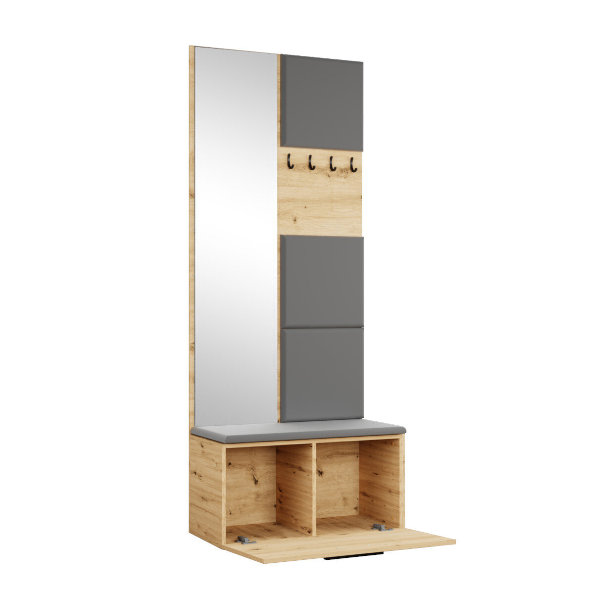 • Wygodne Siedzisko z Szufladą: Zintegrowane, tapicerowane siedzisko ułatwia zmianę obuwia, a pojemna szuflada pod nim to idealne miejsce na przechowywanie akcesoriów.