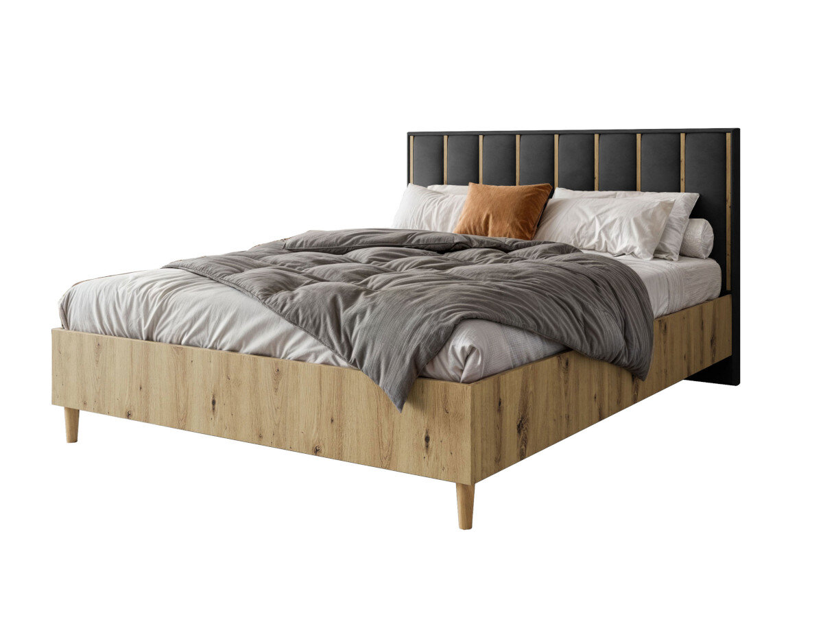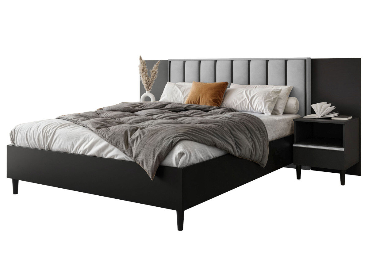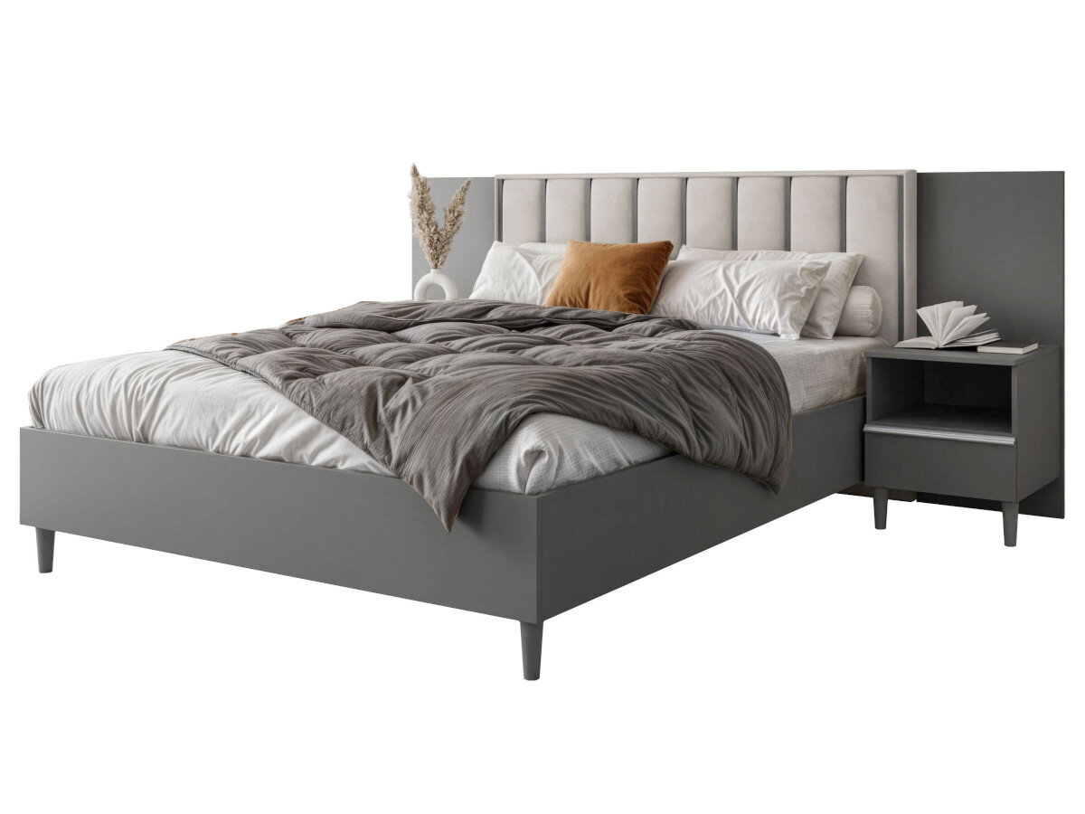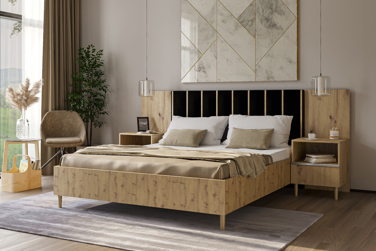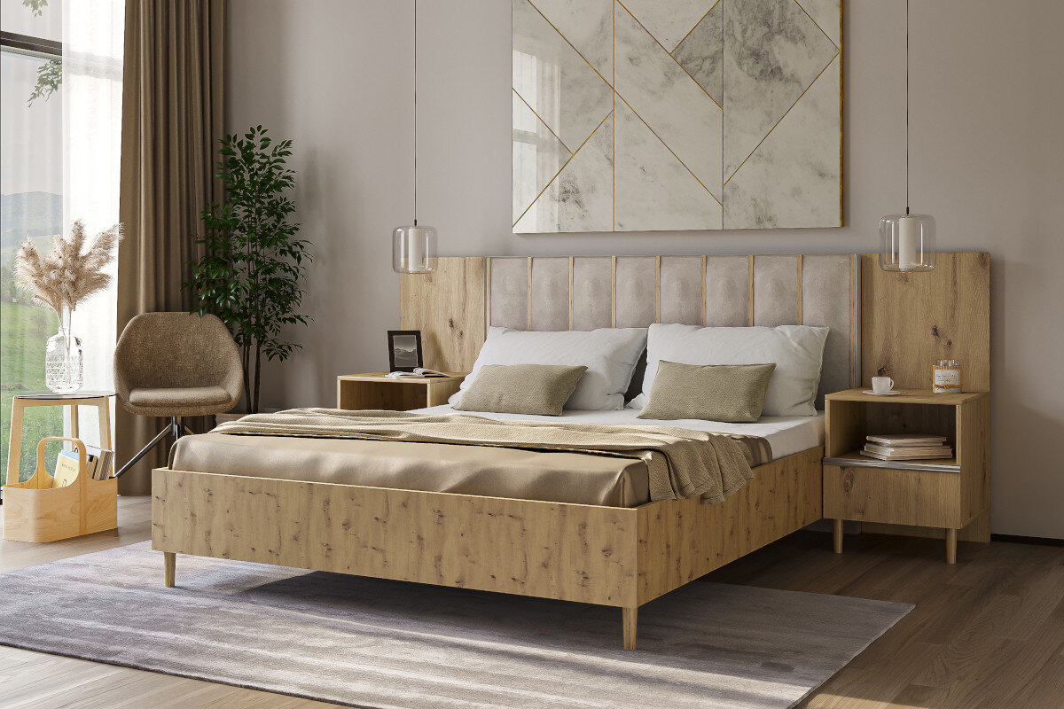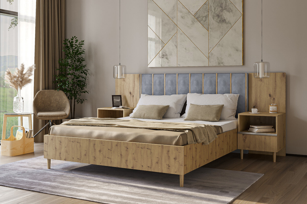 - Materiał: Płyta meblowa laminowana 16 mm, nogi drewniane, tkanina obiciowa, lamele.