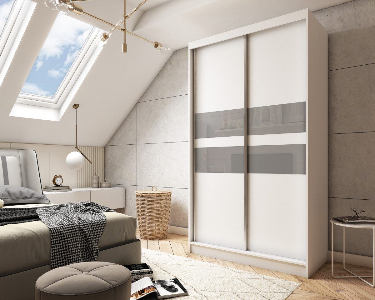 Odkryj szafę przesuwną Finezja, która łączy w sobie minimalistyczną elegancję z nowoczesnym akcentem, idealnie wpisując się w aranżację Twojej sypialni, garderoby czy przedpokoju. Jej unikalnym elementem są cztery poziome pasy ze szkła lacobel, które subtelnie przełamują gładką powierzchnię frontów, dodając im głębi i wyrafinowanego charakteru.