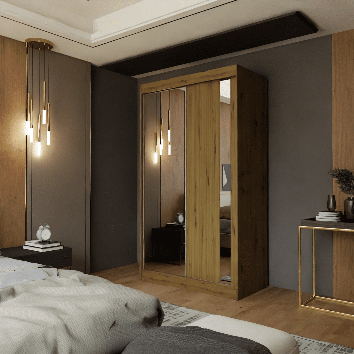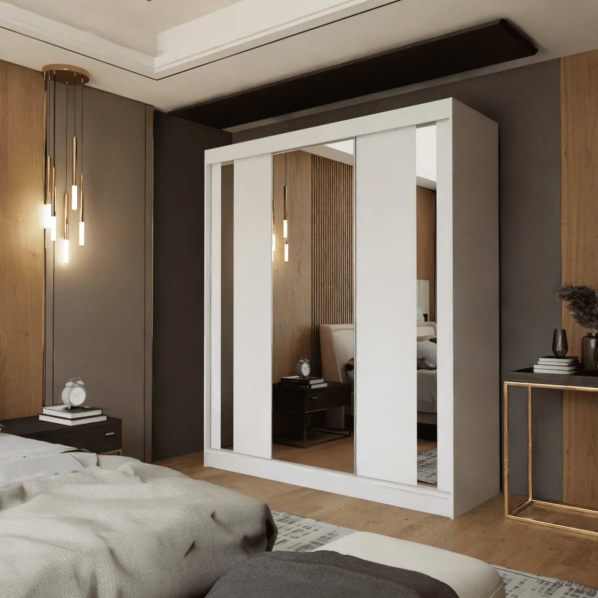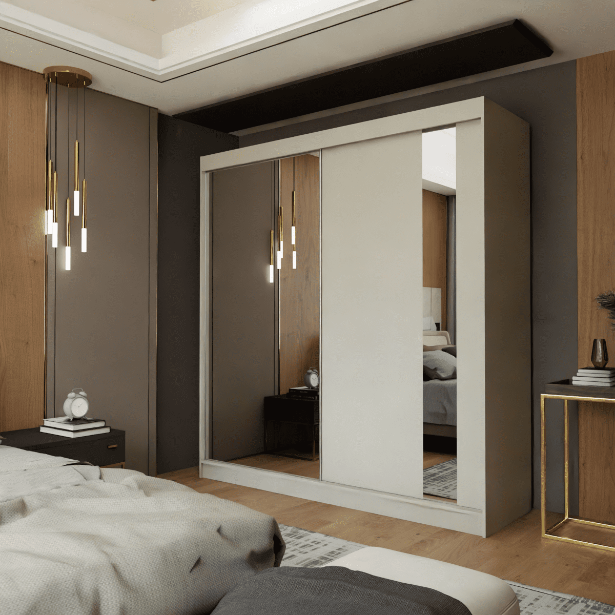 - ✅ Unikalny design z lustrem: Asymetryczne połączenie gładkiego frontu z dużym lustrem i ozdobnym, lustrzanym pasem nadaje szafie oryginalnego i nowoczesnego charakteru.