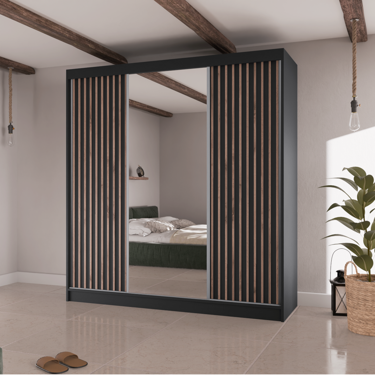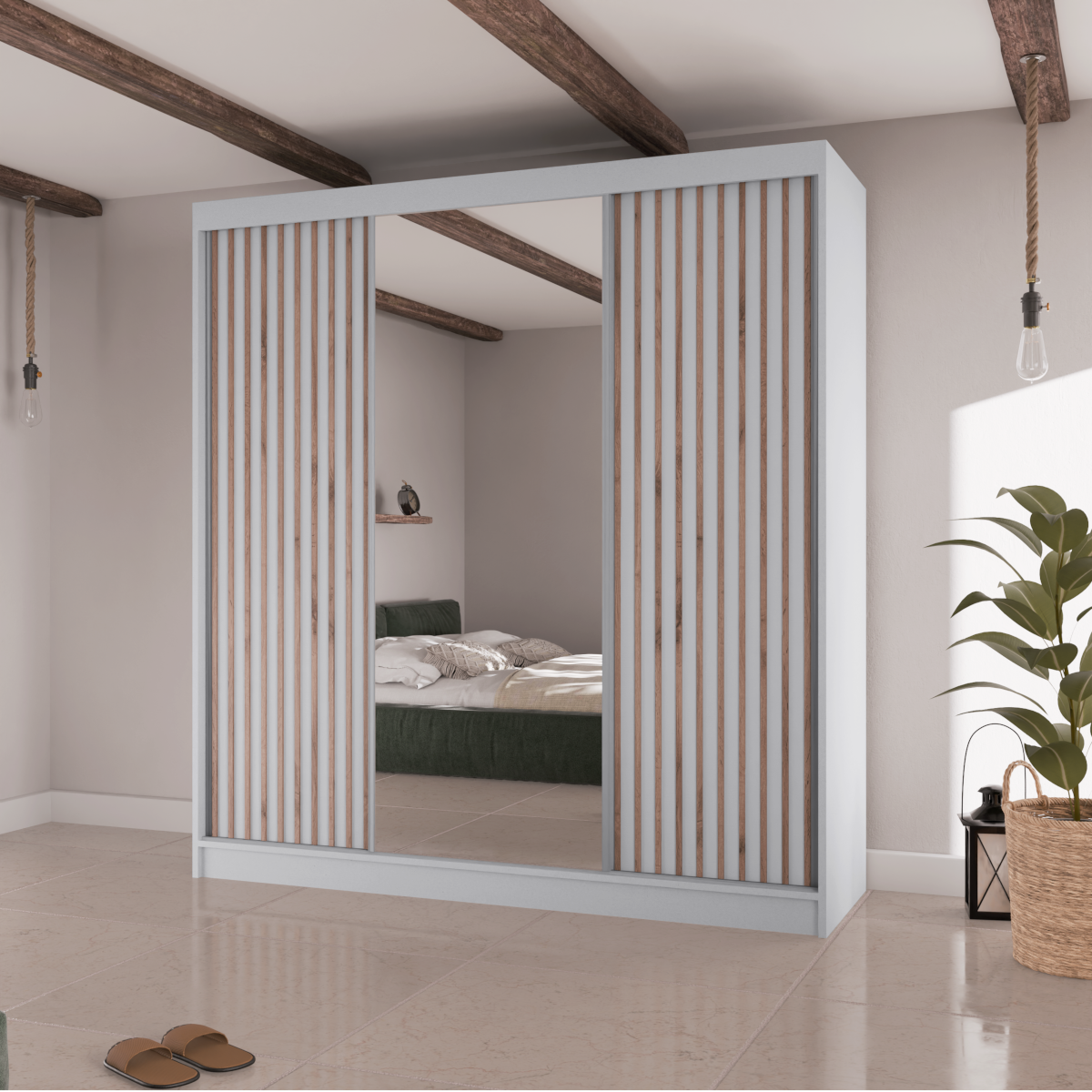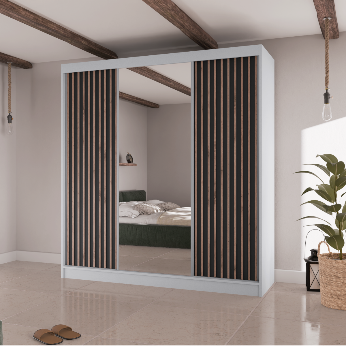 • Idealne Wymiary: Szafa o szerokości 200 cm, wysokości 215 cm i głębokości 61 cm zapewnia mnóstwo miejsca do przechowywania, nie przytłaczając jednocześnie pomieszczenia.