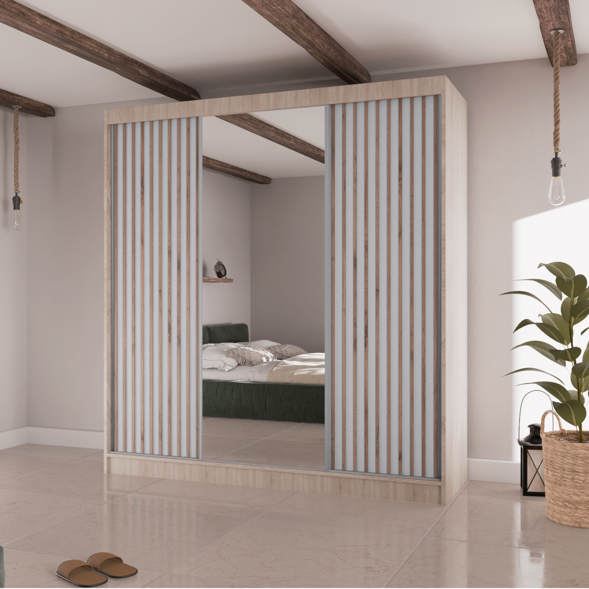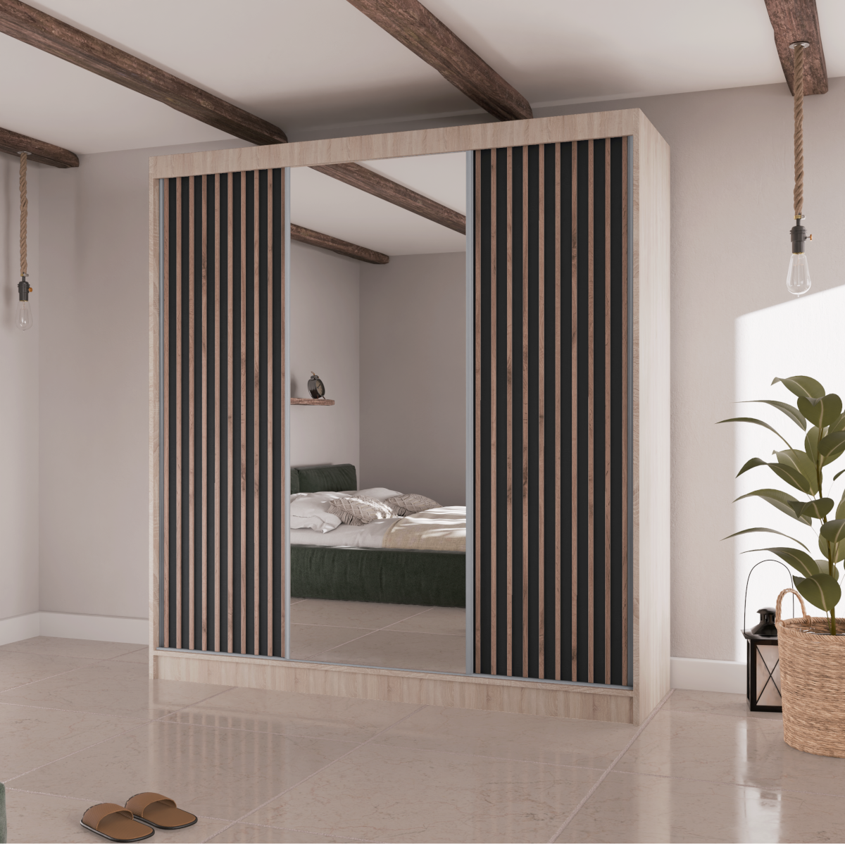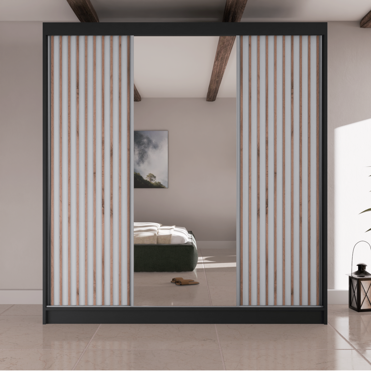 Przedstawiamy model Szafa Przesuwna PRESTIGE LAMEL – mebel, który jest odpowiedzią na najnowsze trendy wnętrzarskie i potrzeby doskonałej organizacji. To idealny wybór dla osób, które pragną nadać swojej sypialni lub garderobie designerskiego charakteru. Boczne fronty ozdobione pionowymi lamelami tworzą zachwycającą, trójwymiarową strukturę, która przyciąga wzrok i dodaje wnętrzu ciepła oraz nowoczesności.