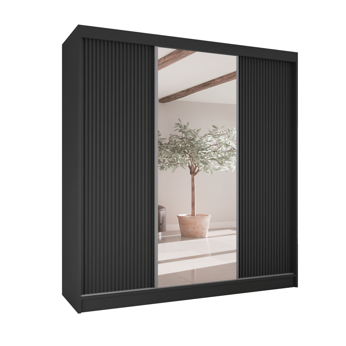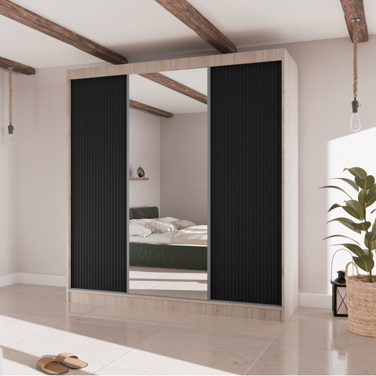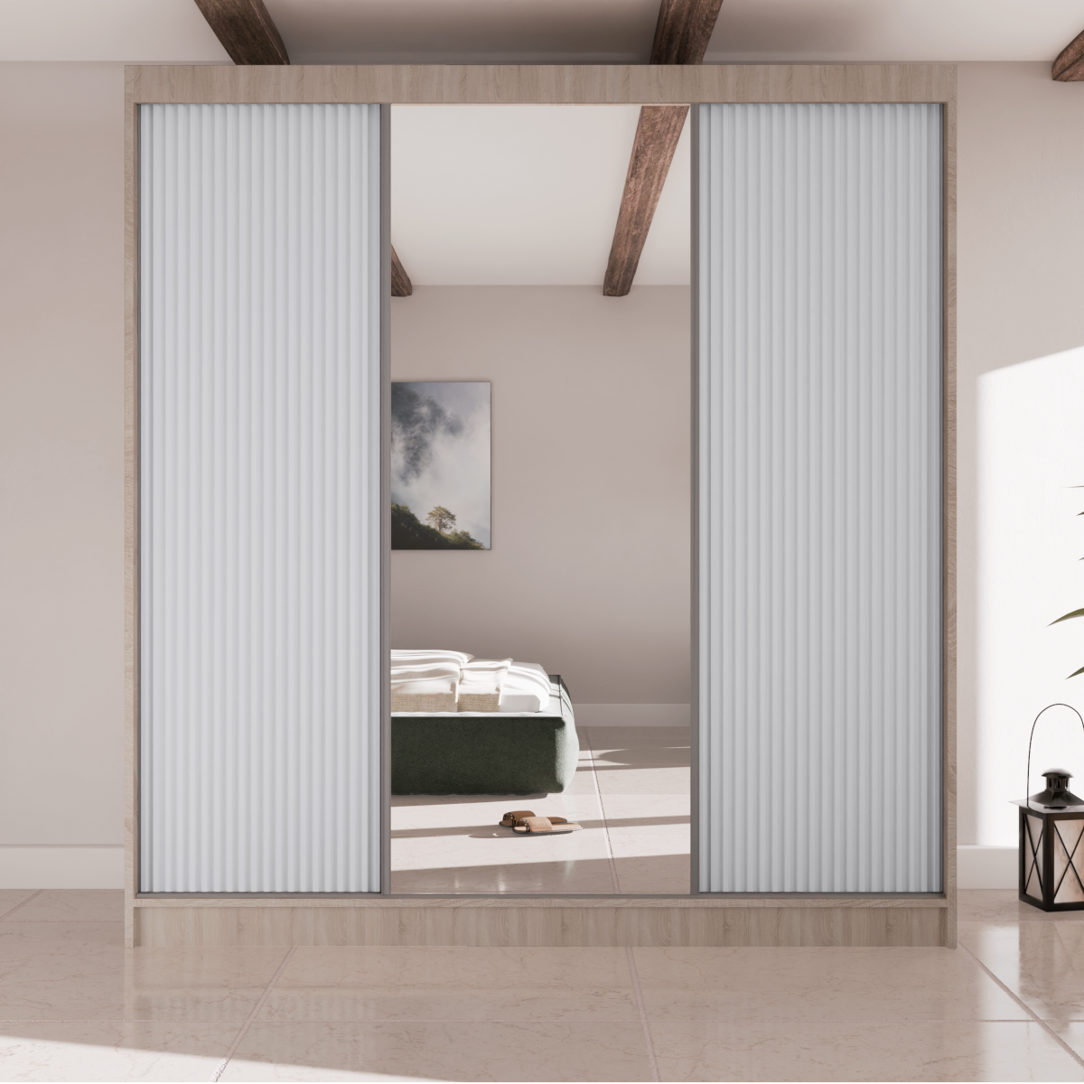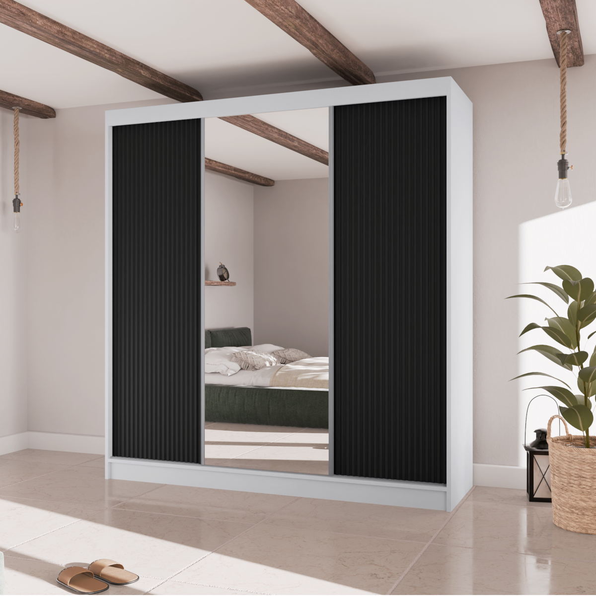 Poznaj szafę przesuwną RYFLE  – mebel, który wniesie do Twojego wnętrza najnowsze trendy i niezrównaną funkcjonalność. To idealna propozycja dla osób poszukujących nie tylko pojemnego miejsca do przechowywania, ale także wyrazistego elementu dekoracyjnego. Charakterystyczne, ryflowane fronty o trójwymiarowej fakturze nadają bryle głębi i unikalnego charakteru, a duże, centralnie umieszczone lustro dodaje elegancji i optycznie powiększa przestrzeń.